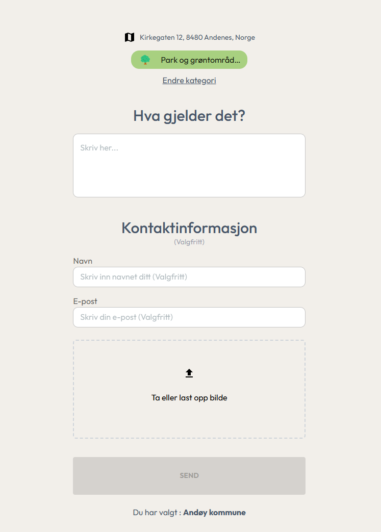 Merk at du kanskje må søke opp hvor du er i kartet (f.eks Dverberg), og at du må trykke ned noen sekunder på ønsket plassering i kartet for at nålen skal flytte seg dit du vil. Merk også at skjemaet ikke tillater å melde inn feil på fylkesveier eller privat vei, kun kommunale veier.