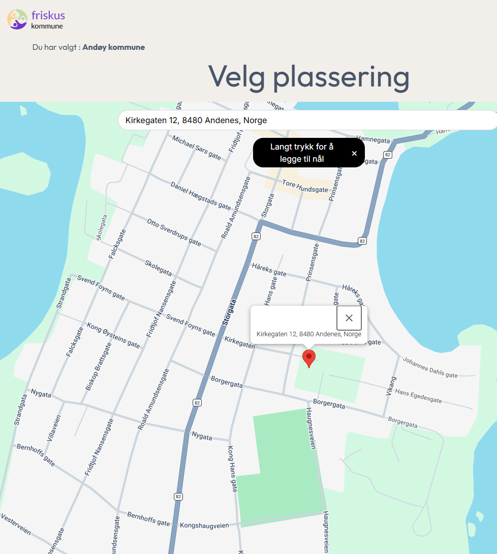 Merk at du kanskje må søke opp hvor du er i kartet (f.eks Andenes), og at du må trykke ned noen sekunder på ønsket plassering i kartet for at nålen skal flytte seg dit du vil.