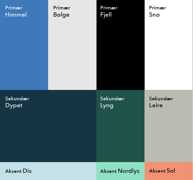 Vår fargepalett består av 10 farger, kategorisert i tre nivåer: primære, sekundære og aksentfarger.
